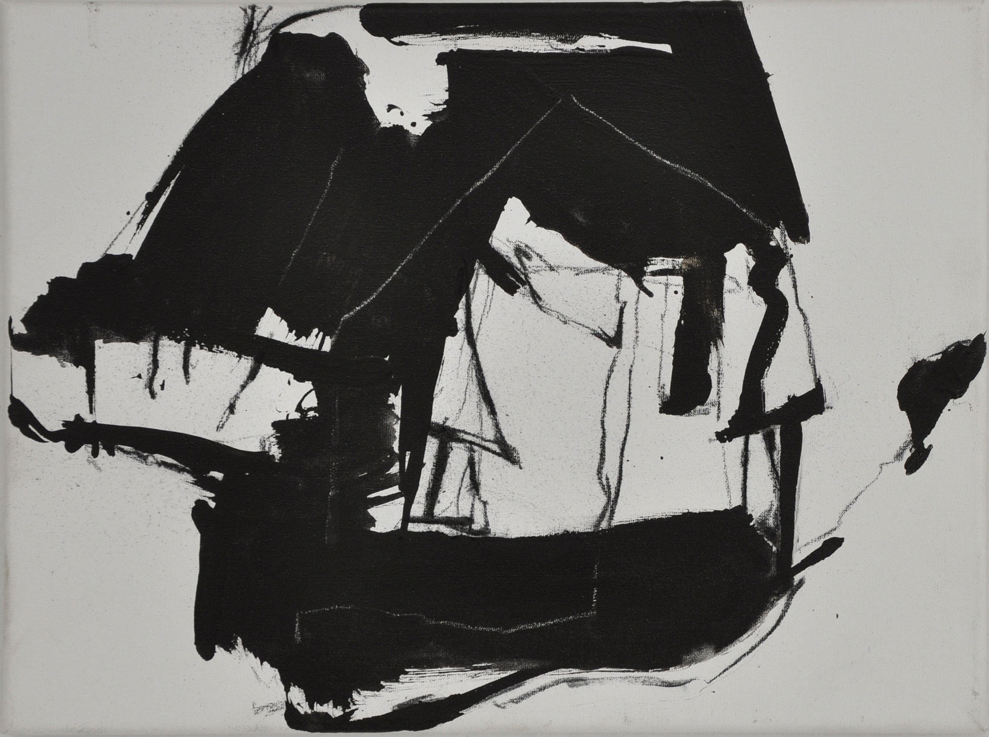 Ein Zelt, ein Gehöft, eine Burg-Ruine. Eine Skihütte – vielleicht schwankend über einem Abhang. In den Behausungen von Max Hari beginnt auch unser Auge zu schwanken. Balanciert zwischen den Perspektiven, tastet sich vorsichtig fragend an die Formen heran. Folgt hier einer Linie, gräbt sich dort durch schwarze Farbmassive, um wiederum in einer Öffnung zu landen; zu entdecken, zu begreifen.